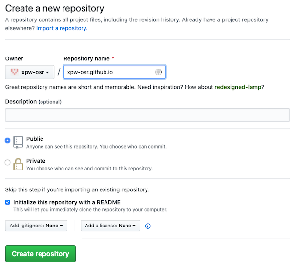 To create the ‘Github Pages’, the repository’s name MUST be ‘<your-github-username>.github.io’. For example, my user name is ‘xpw-osr’, then the repository’s name MUST be ‘xpw-osr.github.io’.