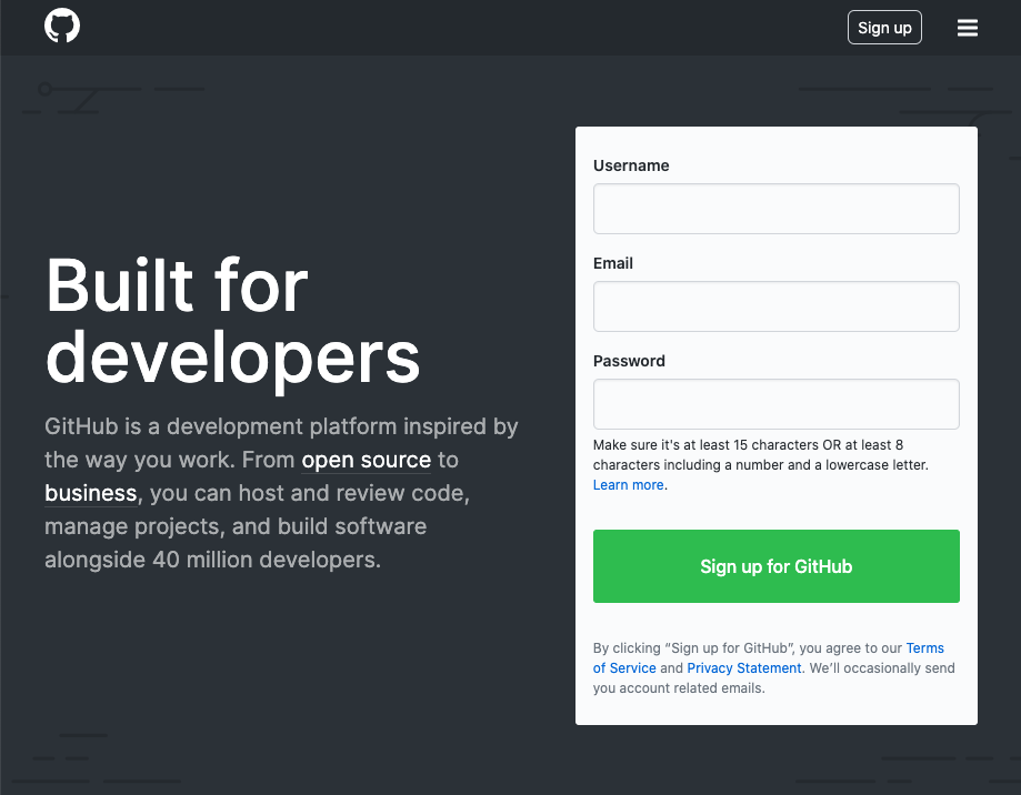 To create account of Github, you can open Github site with any web browser which you like. After the page shown, you will see ‘Sign up for Github’ on the page. It looks like following